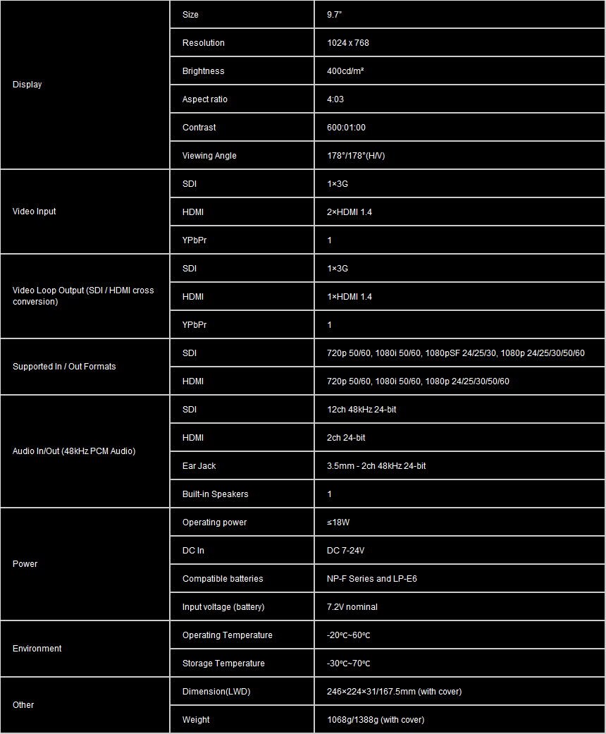 600:1 contrast ratioLilliput understands that accurate colour representation is a vital attribute of a broadcast monitor. That's why 969/S features a 600:1 contrast ratio LCD with IPS technology. |