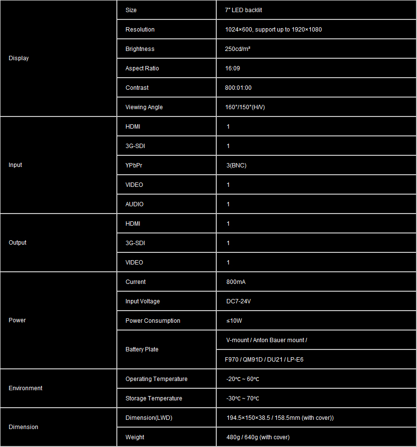 The 665/S is a 7 inch 16:9 LED field monitor with 3G-SDI, HDMI, YPbPr, component video, peaking functions, focus assistance and sun hood. Optimised for DSLR & Full HD Camcorder.