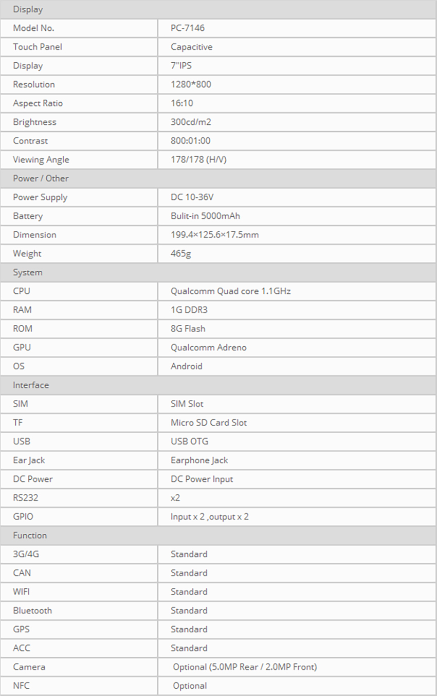 Interface: Micro SD card slot, SIM card slot, USB OTG ×1, Earphone jack, DC power input, RS232×2, CAN BUS