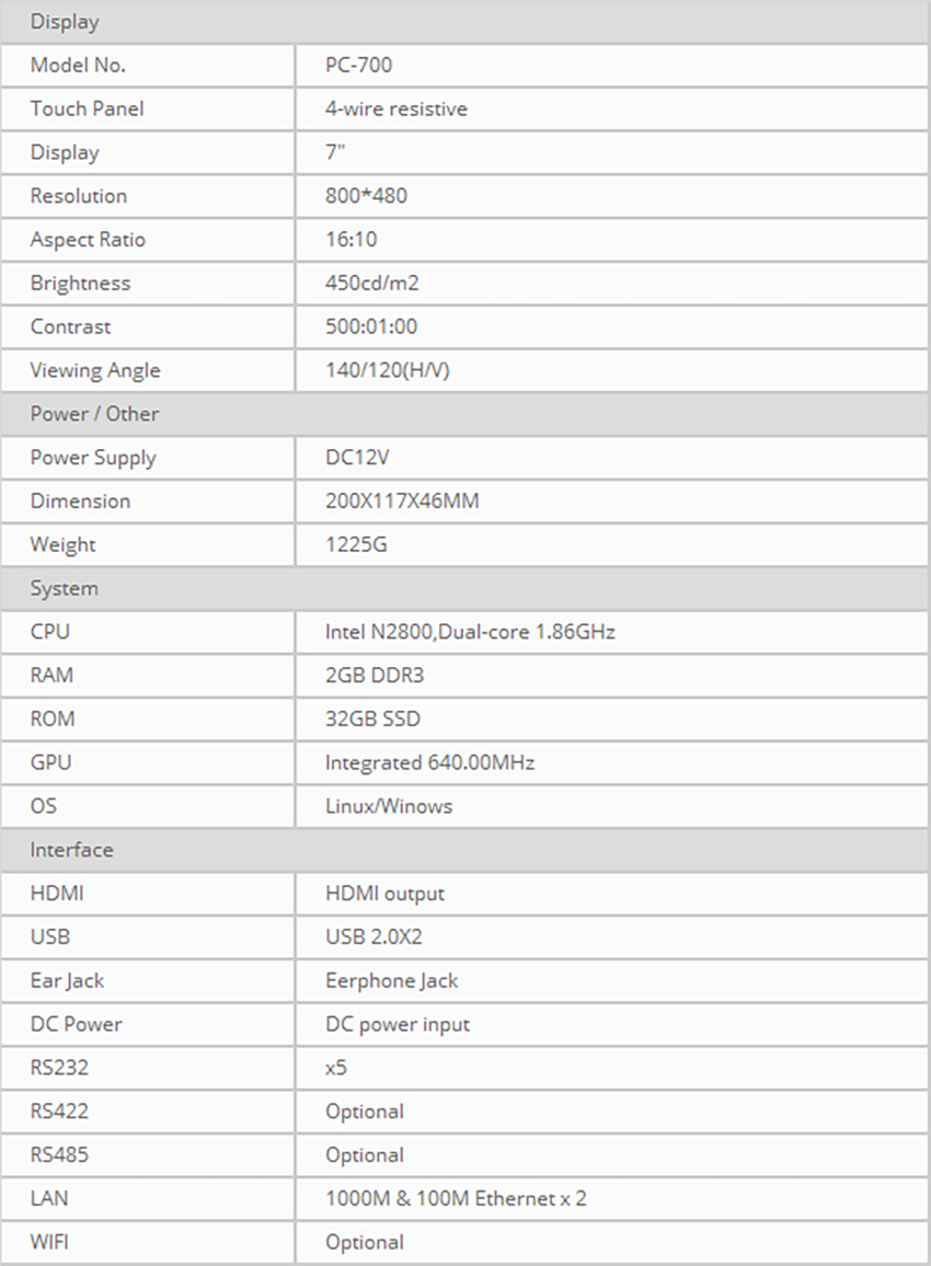 - 7 inch 450cd/m² brightness display with resistive touch;