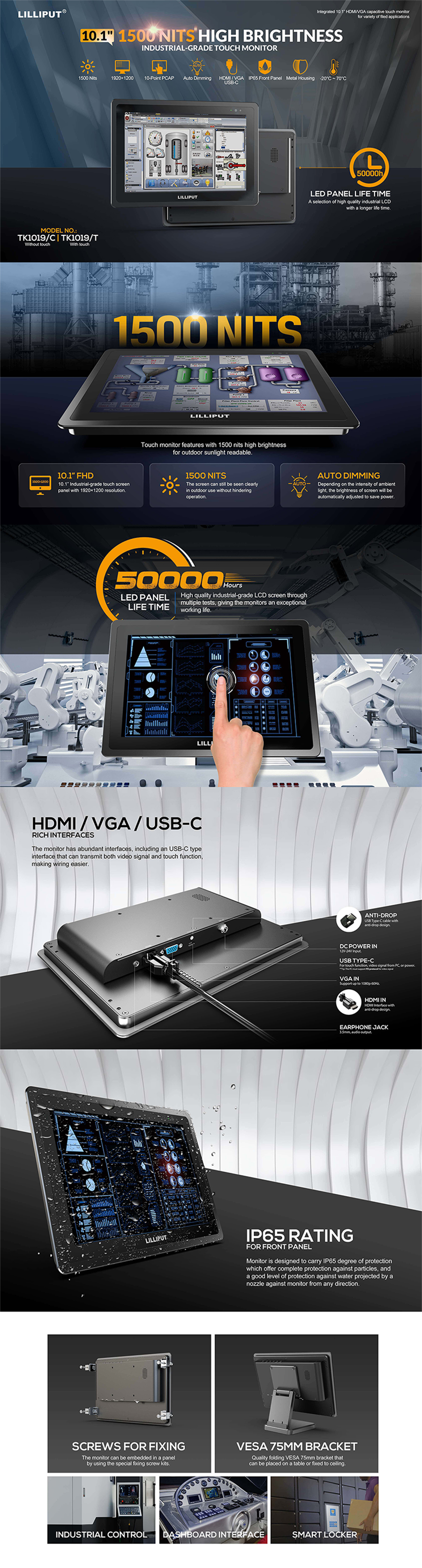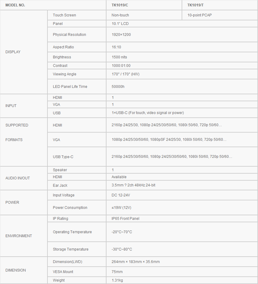Feature:1500nits Brightness, 10-points PCAP, IP65 Front Panel, Metal Housing, Auto Dimming, -20°C-70°C